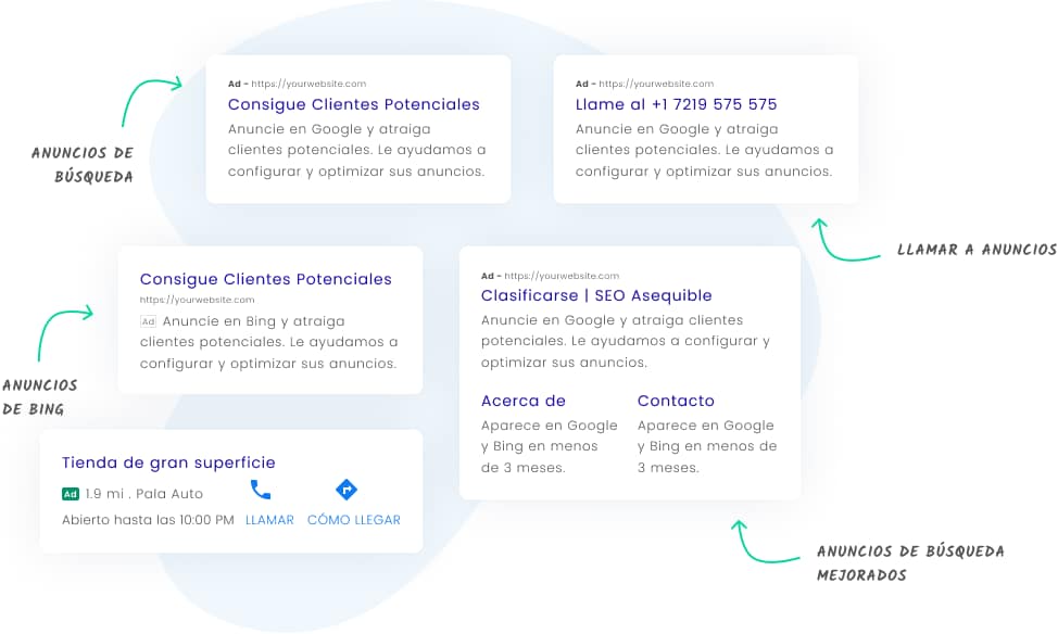 Con los anuncios de búsqueda, puedes mostrar anuncios locales, capturar clientes potenciales de alta calidad y promocionar tus productos con un presupuesto mientras complementas tu crecimiento orgánico. Como parte de nuestras campañas publicitarias, utilizamos varios tipos diferentes de concordancia de palabras clave para activar tu anuncio, junto con palabras clave negativas para evitar que tu anuncio se active cuando los usuarios buscan palabras clave irrelevantes.