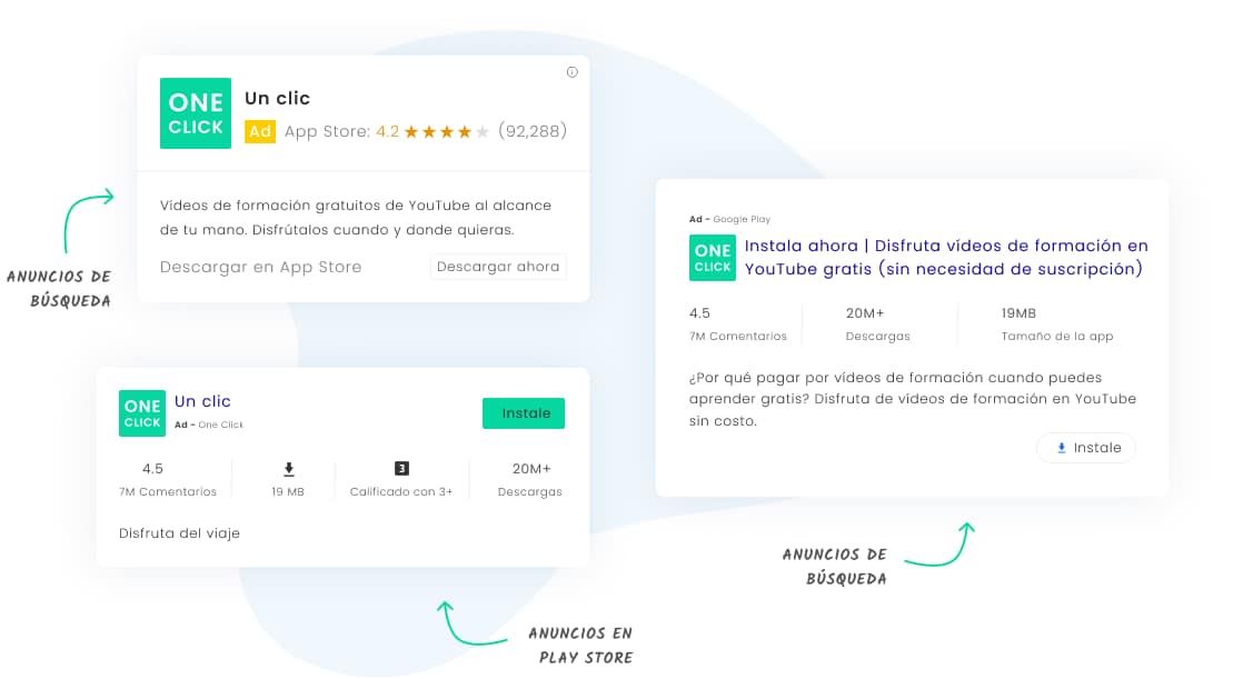 Hay varios lugares donde podemos mostrar los anuncios de instalación de aplicaciones y los cubrimos todos, como los anuncios de instalación de aplicaciones de Facebook, Twitter, Snapchat, Pinterest, YouTube o en la barra de búsqueda, Así como también anuncios de banner, anuncios de Appstore, etc.